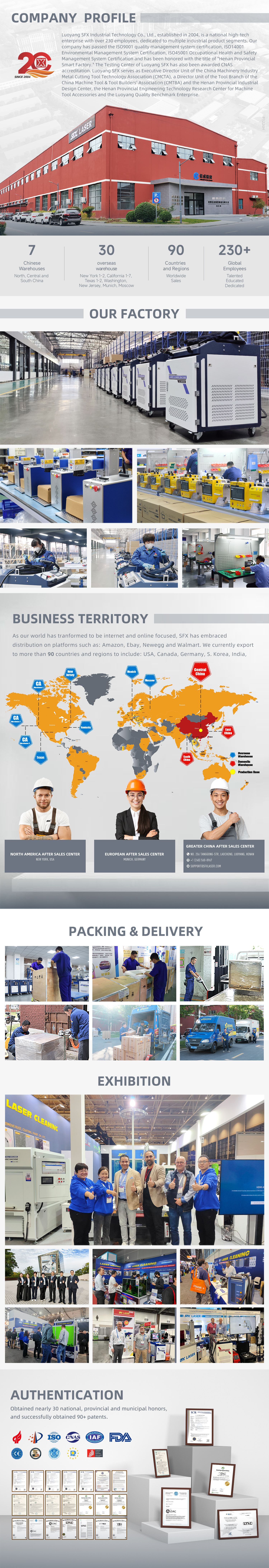 Luoyang SFX Industrial Technology Co., Ltd., fundada en febrero de 2004, se ha convertido en un proveedor líder mundial de soluciones láser innovadoras. Más de 90 patentes y nuestros productos se distribuyen en más de 90 países, y aproximadamente el 70 % de nuestros productos se exportan a nivel mundial.