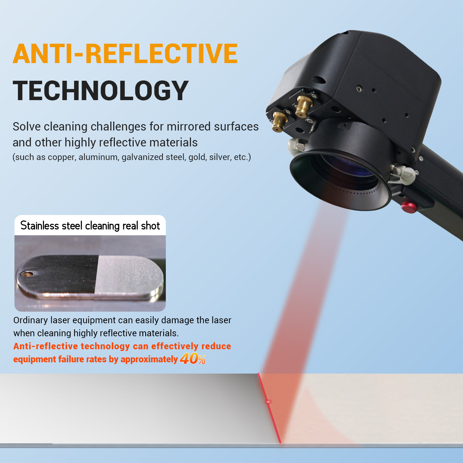- Fuerte tecnología anti-alta reflexión, Al limpiar materiales de alta reflexión como cobre, aluminio, oro, plata, chapa galvanizada, etc., no dañará el láser.